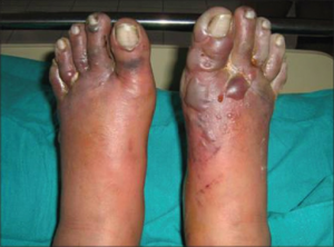 Hemorrhagic blisters form and are associated with skin necrosis and blue-gray discoloration Skin is mottled with nonblanching cyanosis and formation of deep, dry, black eschar
