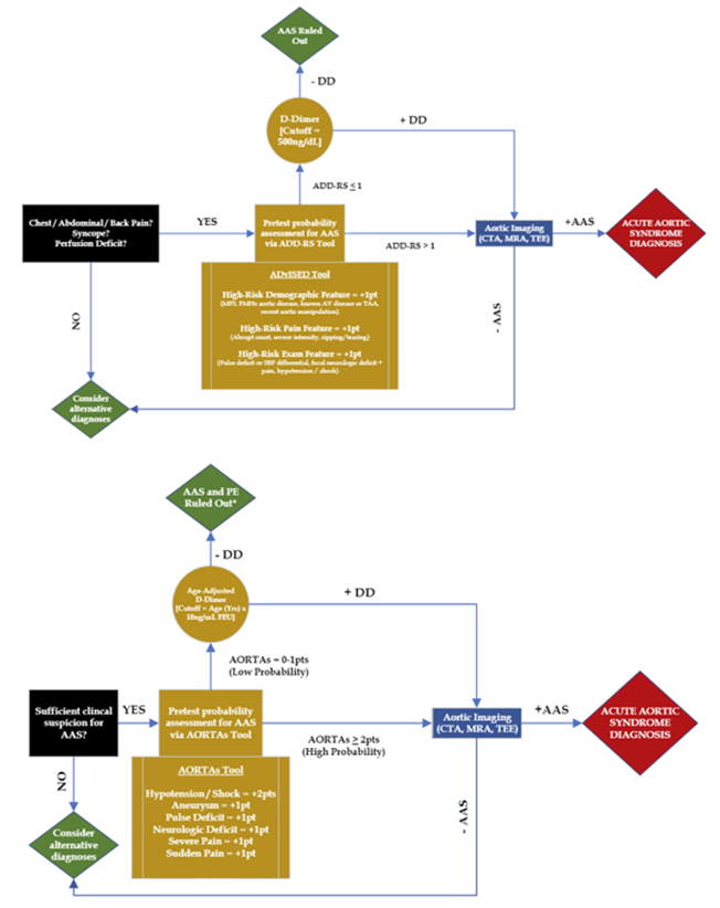 - Clinical decision-making tools and algorithms are available (e.g., ADvISED Trial ADD-RS + D-dimer, AORTAs Algorithms), but are not yet externally validated (see Figure 3, Table 1).[6]