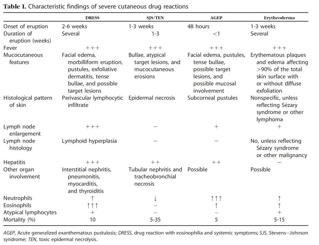 Characteristic findings of severe cutaneous drug reactions. From First10EM https://first10em.com/dress-syndrome/