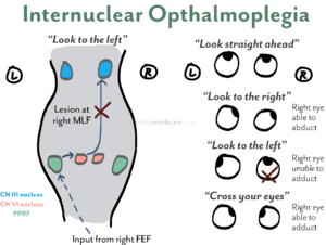 [[File:Ino v2.png|thumbnail|Internuclear opthalmoplegia, courtesy of sketchy medicine]] | [[File:Ino v2.png|thumbnail|Internuclear opthalmoplegia, courtesy of sketchy medicine]] | ||