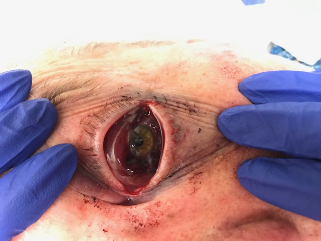 (Hemorrhagic chemosis due to orbital trauma. Of note: the patient was on coumadin. Globe remained intact. The patient's vision was unchanged.) |