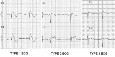 V1-v2 lead placement in 2nd or 3rd IC spaces (rather than conventional 4th IC space) increases chance of recording type I pattern[4]