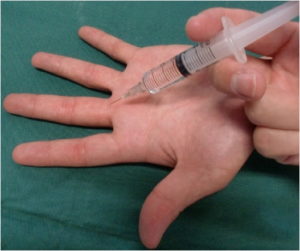 - Insert needle 90 degrees to the skin at the proximal digital crease