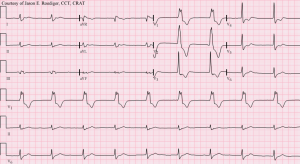 Accelerated idioventricular rhythm (AIVR) at a rate of 55/min presumably originating from the left ventricle (LV). Note the typical QRS morphology in lead V1 characteristic of ventricular ectopy from the LV. Monophasic R-wave with smooth upstroke and notching on the downstroke (i.e., the so-called taller left peak or "rabbit-ear".)